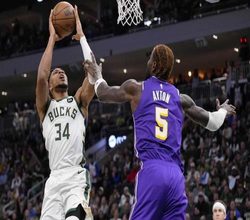 扬尼斯·阿德托昆博为湖人新秀阿杜·蒂耶罗争取到比赛用球,庆祝他职业生涯首球入账由于裁判拒绝将比赛用球判...