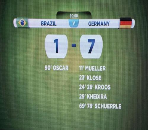 2014年7月8日,巴西世界杯半决赛上演惊世惨案,在贝洛奥里藏特,东道主巴西队1-7遭到德国队血洗,米内罗体育场的比分牌成为了巴西球迷永远的痛。