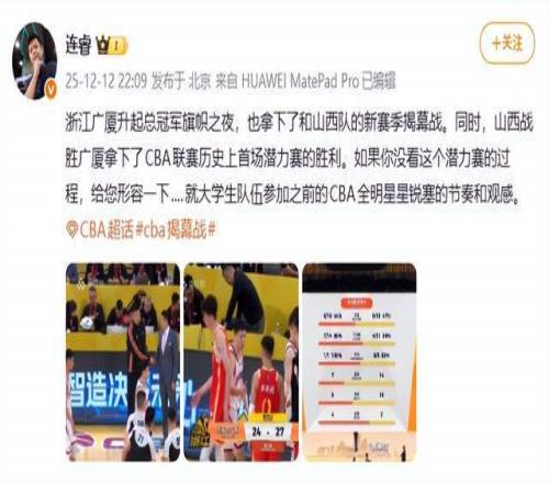 连睿:“浙江广厦升起总冠军旗帜之夜,也拿下了和山西队的新赛季揭幕战。同时,山西战胜广厦拿下了CBA联赛历史上首场潜力赛的胜利。如果你没看这个潜力赛的过程,给您形容一下....就大学生队伍参加之前的CBA全明星星锐赛的节奏和观感。”