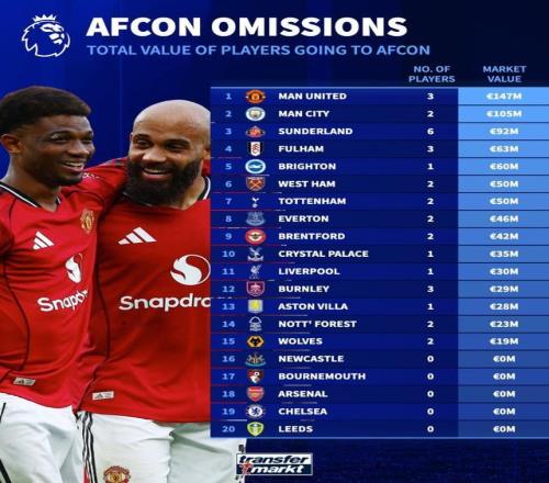 北京时间12月17日,在2025年非洲杯本周末就将打响的情况下,德转列出了英超20支球队非洲杯参赛球员的总身价榜,曼...